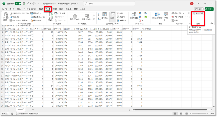 ⑤ データ タブの 分析 グループに データ分析 が表示されていれば追加設定は完了