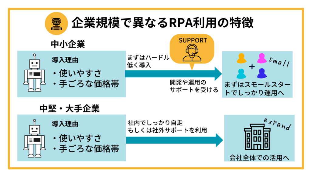 一方、中小企業では「使いやすさ」と「手ごろな価格設定」で導入のハードルは低いものの、IT部門以外の部門では実際のロボット開発や運用が難しく、運用に行き詰まる、ということも起こっています。